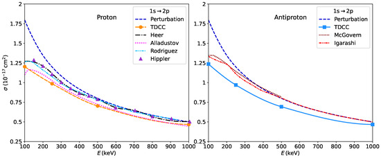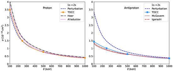 The excitation cross sections for the transition obtained with proton and antiproton projectiles are shown in Figure 5 as a function of projectile energy, in comparison with other theoretical calculations and experimental and recommended data (for proton impact). In this case, our TDCC method leads to slightly lower values relative to the recommended and experimental ones for protons and both theoretical calculations for antiprotons, for all energies. However, for proton projectiles we have obtained good agreement with the most recent calculations of Alladustov et al. [22]. Our perturbational results are higher than the TDCC ones for both projectiles. These show good agreement with other theories for antiprotons and the experimental data for protons above a 500 keV projectile energy, but below this energy, they overestimate all of the other data.