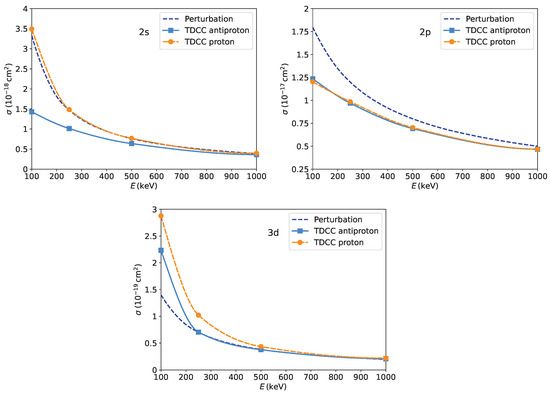 Finally, in Figure 7 we show a comparison of the obtained excitation cross sections with proton and antiproton projectiles by the TDCC method and the first-order approximation, for all three studied excited states. One may observe that, for the excitation of the state, the cross sections for protons and antiprotons are almost identical. This does not mean that higher-order effects are not important, because, as we have seen in Figure 2, transition probabilities depending on the impact parameter differ for the two projectiles. For this excitation, the effects for small and large impact parameters cancel each other out. The first-order perturbational results overestimate the TDCC ones for all energies, especially on the lower side. In the case of the other two studied excitations’ cross sections, the results for protons are comparatively higher than those for antiproton projectiles. As expected, the difference increases for lower impact energies, because here, higher-order effects, responsible for the Barkas effect, are more important. The perturbational results reproduce the TDCC cross sections for the excitation of the state by proton impact almost exactly, and for the excitation of the they are in very good agreement with the TDCC results for antiprotons above 250 keV. Looking at Figure 1, Figure 2 and Figure 3, this agreement is also a result of the cancellation of differences in transition probabilities for small and large impact parameters. It can be also observed, that the difference between proton and antiproton excitation cross sections is significantly larger in the case of dipole-forbidden transitions compared to the dipole-allowed transitions. This behaviour was also observed in the case of the H target [7].