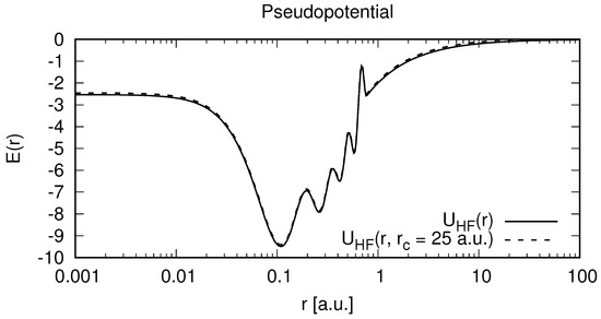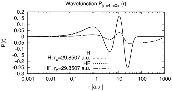 An example of wave function for both perturbed and unperturbed potential for simple Coulomb potential and Hartree–Fock potential is given in Figure 2. The cut-off radius a.u. is used since this is the smallest out of the calculated ones, where a bond level of is realized. It can be seen that in such cases, the wave function differs significantly from the unperturbed cases. Also, the Coulomb potential (CP), solution is almost identical to the HF one, which can be seen in Figure 2. The sets of wave functions are calculated here using the Numerov method of numerical integration, and are given for the unperturbed CP and HF potentials, as well as the cut-off ones (as a part of the dataset).