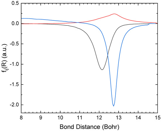 Using the MRCI wave functions, the non-adiabatic couplings were calculated via a finite difference with a step length of a0. The non-adiabatic coupling elements among the lowest three states of symmetry and the five states of symmetry were computed. Figure 3 shows the non-adiabatic coupling elements between the three states, calculated using the aug-cc-pV5Z basis set. These were the states most important for the mutual neutralization reaction, and as demonstrated in the figure, the non-adiabatic coupling elements were similar in magnitude. The non-adiabatic coupling peaked at the avoided crossings. The adiabatic wave functions changed character in these regions, and as a result, there were significant non-adiabatic coupling elements. All three states interacted simultaneously, so successive state interactions could not describe the charge transfer process.