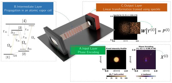 Schematic of the purposed optical extreme learning configuration (exaggerated scales for illustration purposes). (A) Each input of the dataset is encoded into the phase profile of the incident flat top weak probe beam , which can be achieved with a spatial light modulator, for example. (B) The probe beam propagates inside a cell filled with an atomic vapor with a N-type 4-level atomic system, which acts as the intermediate layer of the OELM. (C) After the propagation, the speckle pattern is recovered at the end, with the pixel intensity values being utilized as the output state for training the linear transformation that completes the extreme learning machine architecture.