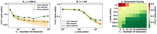 To explore this framework, we test the system with the regression of the function . The dataset is comprised of 64 points equally distributed in the interval [−3, 3] with an 80–20% train-test split where a standard Ridge Regression methodology from the sklearn Python library is used to train the output layer []. Taking the root mean squared error (RMSE) as an evaluation metric, the results obtained are presented in Figure 3. As we can see, both the the dimensionality of the output space and nonlinear strength g are important for achieving a good performance in the regression task, achieving an error below 5%, meaning that both play a role as hyperparameters of the model. Yet, looking at Figure 3C, one can see that the nonlinear dynamics are more important for achieving a good performance than simply increasing the number of output channels, meaning that the dimensionality is important but not sufficient. Indeed, this becomes evident when computing the error of the noisy dataset (same input data but with 5% random noise added on top of it), for which one sees a decrease in the accuracy of the predictions with the increase in the , which suggest an overfitting of the model with the increase in .