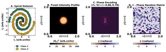 with the encoding obtained using a min-max normalization of the features (see Figure 2 for spatial distributions and encoding strategy). The additional fixed random phase distribution warrants the generation of speckles in such a short distance and randomness of the projection onto the output space and can be applied experimentally using a spatial light modulator or an optical diffuser, for example. For each state, we propagate it numerically, taking the intensity at (i.e., imaging the intensity at the output plane) and recording a region of interest(ROI) of 60 × 60 pixels around the center . We further downsampled the ROI by averaging regions of 2 × 2 pixels, before randomly choosing superpixels as the output state . Note that the effective dimensionality of the output space may be higher or lower than , and it is associated with multiple factors such as the type of activation function and encoding strategy. Indeed, from a purely theoretical perspective, the only formal statement known is that if the matrix has then it can learn a dataset of elements with zero error, which would imply []. Still, this statement does not impose major constraints on performance as one does not require for effective learning [,]. Indeed, a higher may be detrimental to performance as it may lead to overfitting issues that must be dealt with using convenient regularization techniques.