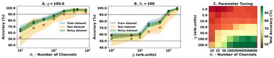 Utilizing the logistic regression as a classification model, we followed the same 80–20% train-test subset division procedure and varied the number of channels and the nonlinear strength g, obtaining the results depicted in Figure 5. As in the regression task, the results again suggest that the output dimensionality and nonlinear strength of the physical system are both important parameters, but only the nonlinear strength warrants good accuracy. In ideal conditions, train and test accuracies above 90% can be achieved, meaning that the model is not overfitting and validating our conceptual proposal as an effective OELM capable of performing nonlinear classification tasks.