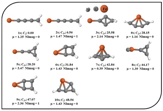 The study of transition metal clusters, especially first-row transition metal clusters, has sparked the interest of several research groups over the years due to the clusters’ unique structural, electronic, magnetic, and catalytic properties [1,2,3,4,5]. Iron (Fe) is one of the universe’s most prevalent heavy and refractory elements. Iron–carbon clusters have provided an in-depth understanding of geometrical properties, electronic structures, and magnetism among the transition metal clusters because of iron’s position between early and late transition metals due to experimental measurements [6,7,8] and theoretical calculations [9,10,11]. Experimental studies on the iron–carbon clusters include mass spectrometry, infrared isolation matrix spectrometry, anion photoelectron spectroscopy, and gas-phase ion chromatography [7,8,12,13,14,15,16]. FeCn (n ≤ 8) [17,18,19,20] and FenC (n ≤ 13) [21,22,23] iron–carbon clusters have been theoretically examined in the past, and some of them have been reported experimentally [24]. The clusters of iron, carbon, and hydrogen have also been the subject of similar studies. In 1987, for the first time, neutral FeCHn (n = 0–3) systems were produced and characterized in the gas phase by Schwarz et al. using neutralization–reionization mass spectrometry (NRMS) [25]. Fan et al. have investigated FeCn and FeCnH (n = 2) clusters via anion photoelectron spectroscopy [26]. The cation of the FeCH2 cluster was also investigated experimentally via photofragment spectroscopy [27]. In 2003, Boesl et al. identified the FeC4H2 neutral complex experimentally using mass selective photo-detachment photoelectron spectroscopy [28]. In 2013, Chandra and coworkers conducted studies on the molecular and spectroscopic properties of iron-containing ring molecules, including theoretical studies on cyclic compounds like FeC2, FeC3, FeC3H2, FeC2H2, FeC2H4, and FeC3H4, which are of astrophysical interest [29]. Transition metal clusters have gained potential applications in various fields since the discovery of metallocarbohedrene in 1992 [30]. The list extends from materials to the emerging field of nanotechnology and also exhibits remarkable applications in organic chemistry [16,31,32,33,34]. A prominent instance is the challenging activation of methane by iron carbide cluster ions [5,35]. Another interesting application of these compounds is their catalytic activity in oxygen reduction, COx (x = 1, 2) reduction, and also in Fischer–Tropsch synthesis [36,37,38,39]. Energy and hydrogen storage are further applications of these compounds [40,41,42,43]. The prospective applications of these iron–carbon clusters extend beyond material science; other significant areas include surface chemistry, astrochemistry, and combustion chemistry.
