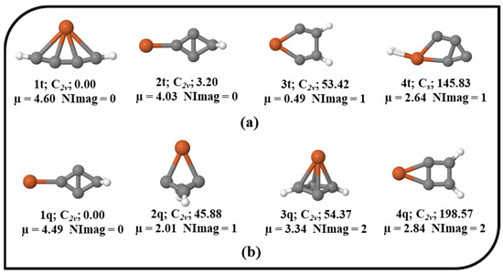 The potential energy surface (PES) of Fe in the singlet, triplet, and quintet electronic states was explored. The ten energetically low-lying isomers of the singlet electronic state of the Fe system are shown in Figure 1 with their relative energies, point groups, number of imaginary frequencies, and dipole moments. All other optimized isomers of Fe in the singlet electronic state are provided in the Supplementary Material. For brevity, the total electronic energies, zero-point vibrational energy (ZPVE) corrections, ZPVE-corrected total energies (E+ZPVE), absolute dipole moments, relative energies without (∆E) and with ZPVE corrections (∆E + ZPVE), and the number of imaginary frequencies (NImag) are provided in Table S1 in the Supplementary Material. In the unrestricted UωB97X–D approach (results are provided in the Supporting Information), the optimization of the quintet and triplet electronic states shows significant and non-trivial spin contamination. Therefore, we made an effort to optimize the geometries in the triplet and quintet electronic states with the ROHF wavefunction to prevent spin contamination. Nevertheless, in the triplet and quintet electronic states without spin contamination, the number of optimal geometries was lowered to four. The optimized geometries of the triplet and quintet electronic states with ROHF are shown in Figure 2. Isomers 1s, 1t, and 1q are the global minima of the singlet, triplet, and quintet electronic states, respectively. 1s has a linear structure, and the structure like iron is directly attached to the cumulene carbene. As cumulene carbene has already been detected in the interstellar medium (ISM) [83], the global minimum of singlet electronic state 1s suggests that the presence of iron atoms in the ISM might be in the form of these iron hydrogenated carbides. The isovalent pentatetraenylidene, an isomer of C5H2, has already been a familiar molecule in the laboratory as well as in the ISM [84,90]. As 1s is a global minimum, it has a higher chance of being viable in the laboratory. It is also polar with a dipole moment value of 1.25 Debye indicating feasible detection in the ISM. 4s contains planar tetracoordinate iron (ptFe), which should be considered an accidental surprise in the PES of the singlet electronic state. 1t also contains ptFe, which has been identified as a global minimum in the PES of the triplet electronic state. 1q has a cyclic structure that is a local minimum in the singlet electronic state, and a similar geometry has been identified as a local minimum (2t) in the triplet electronic state. The main focus of the present work was on isomer 4s, which contains ptFe in the singlet electronic state. It lies ~28.15 kcal mol−1 above its lowest energy isomer, 1s. The point group of 4s is C2v, and its dipole moment value is 1.16 Debye. To probe into the ptFe, the chemical bonding characteristic features were investigated in detail.