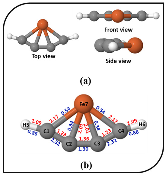 (a) The top, front, and side views of the ptFe, 4s; (b) The bond lengths (in Å, red) and the Wiberg bond indices (in blue) of 4s obtained using the ωB97X–D functional with SDD and 6–311++G (2d, 2p) basis sets.