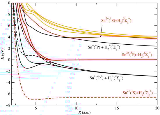 Potential energy curves of the (SnH2)2+ system as functions of the distance of the nucleus to the midpoint of the internuclear axis. The red lines are the energies of the electronic states correlating to + . The black lines represent the energy curves of the states dissociating into + . The orange lines are the energies of other states not included in the dynamical calculation. Solid and dashed lines correspond to triplet and singlet subsystems, respectively.