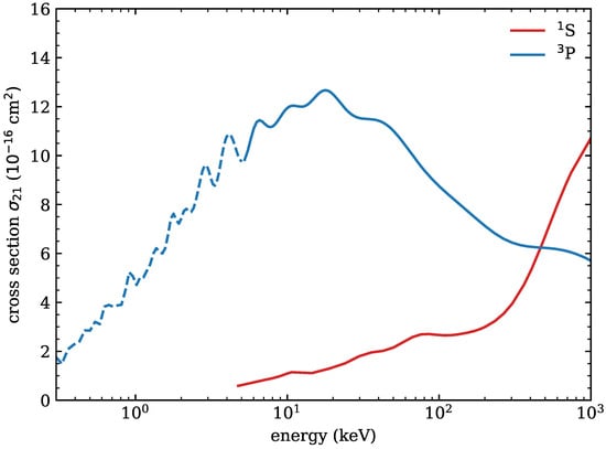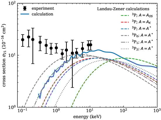 The entrance channel of the capture process (3) is a mixture of three spectroscopic levels with , while a single state, representing the 3P term, has been considered in the non-relativistic theoretical description used in this paper. To determine the effect of the spin-orbit splitting, and to investigate the possibility that a highly J-dependent cross-section may explain the large experimental cross-sections at low energies, exploratory Landau–Zener calculations were performed. The results are also plotted in Figure 4. First, two-state calculations were performed with the 3P term as entrance channel, assuming a statistical J distribution. Following Olson and Salop [] as well as Magee [], the coupling matrix element includes the Franck–Condon factor of the most probable vibrational state of , which is [], to account for the molecular nature of the target. As already mentioned in the introduction, the coupling matrix element has an empirical prefactor A. Commonly used values are proposed by Olson and Salop [] and proposed by Kimura et al. []. Calculations were performed for both values. Both curves have a similar shape as the semi-classical calculation, but lie roughly 30% lower. The Kimura curve peaks at almost the same energy as the semi-classical curve, whereas the Olson–Salop curve peaks at one order of magnitude higher energy. This means that molecular hydrogen as a target is better approximated by a He atom than by a H atom. We however choose to optimize the prefactor such that it peaks at exactly the same energy as the semi-classical calculation, and find a value of 5.8, which we denote by . This prefactor is subsequently used to perform Landau–Zener calculations for the three J levels. Due to the fact that the spacing between those levels is smaller than the adiabatic splitting, we treat them independently instead of performing multichannel calculations. It can be seen from Figure 4 that the resulting curve for , and to a lesser extent also for , shifts up and its maximum moves to lower energies. From this, we may conclude that the J-distribution of the 3P term is not statistical but has a preference for J equal to 0 and 1. However, the large experimental cross-sections below 1 keV can still not be explained.