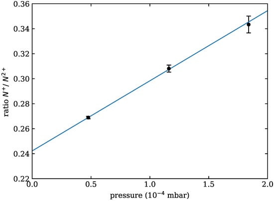 Ratio , i.e., f, measured at three pressures for incoming ions of 1 keV (black symbols). The blue line is a least-squares linear fit to the data. The resulting y-intercept and slope are used to calculate according to Equation (13).
