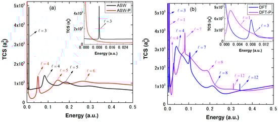 TCS of elastic scattering using (a) ASW (black) and ASW-P (red); (b) DFT (blue) and DFT-P (magenta). Resonances are labeled with corresponding partial wave numbers. The inset shows magnified TCS in the low-energy region.