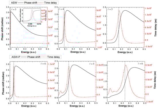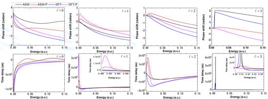 Figure 3 illustrates the near-threshold phase shift and EWS time delay behavior in ASW and DFT approximations; time delays are presented in attoseconds (as). In the zero energy limit, the phase shift and time delay follow the Wigner threshold law [59]. Since the s-wave phase shift behaves as , it approaches as , which is evident in the figure for the case of . The corresponding time delay goes to negative infinity , which is also clear in the bottom panel for . According to the Wigner threshold law, the phase shift for other partial waves is . Therefore, in this case, the phase shift should tend to zero in the zero-energy limit, as shown in the upper panel in Figure 3. The corresponding time delay must vanish for the partial waves in the low energy limit, since . Hence, the current set of results is consistent with the Wigner threshold law. Note, that the time delay in the present context is regarding a free unscattered electron. A positive time delay refers to a delay of scattered electrons reaching the detector compared to unscattered ones as if it feels like a transient attraction. Likewise, a negative time delay suggests the scattered electron is reaching the detector earlier than the reference electron. The latter is indicative of the electron receiving a repulsive push during the scattering.