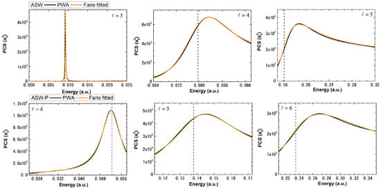 Comparison of elastic scattering resonant cross-sections calculated using PWA (black) for ASW (upper panel) and ASW-P (lower panel) with their Fano fitting profiles (orange). Vertical lines indicate the resonant energies .