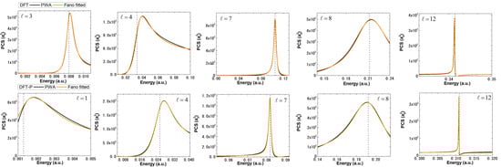 We also perform the Fano fitting analysis of the resonances obtained from the DFT and DFT-P model potential and the resulting values of the Fano parameters are listed in Table 3. In Figure 5, the fitted profiles for DFT (upper panel) and DFT-P (lower panel) are shown. The parametric values evolve very differently from DFT to DFT-P. In DFT, a resonance is noted for the partial wave 3, which yields 6.23 and a considerably large background cross-section . Consequently, the resonant shape is asymmetric. A resonance exists for 1 in DFT-P with energy 0.0013 a.u., 2.48, , and its asymmetry suggests a larger background cross-section. A common set of resonances for partial waves ( 4, 7, 8, and 12) is shown in DFT and DFT-P. The q value increases from 1.65 to 2.79 for 4 when the polarization effect is added. Furthermore, decreases both in the resonant width and background cross-section imply that for the polarization effect sharpens the resonance. When polarization effects are taken into account, the q value for 7 rises from −21.20 to −9.30, while for 8, the q value falls from 12.45 to −15.25. From Table 3, one notes that the resonance width is the narrowest for 12 in both DFT and DFT-P implying a prolonged lifetime. The corresponding q values for DFT and DFT-P are −5.60 and −4.53, respectively.