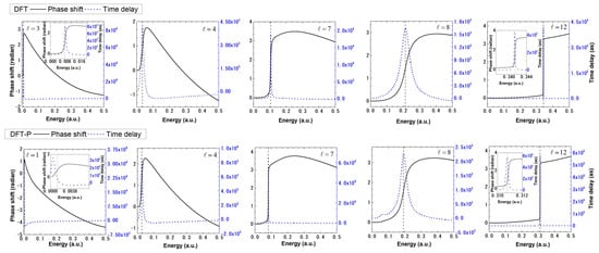 For the interaction modeled by DFT, more resonances are seen. This is, as noted before, because of the intrinsic diffused shape and a deeper well in the DFT model. Phase shifts and the corresponding time delay profiles of resonant partial waves are shown in Figure 7. We first analyze the DFT case without polarization (Figure 7, upper panel). Here, the resonance condition is satisfied for the partial waves 3, 4, 7, 8, and 12. As seen, 12 exhibits the sharpest resonance, followed by 3, 7, 4, and 8. The longest resonant delay is noted at 0.3414 a.u. for 12 with fs. At 0.2120 a.u., the shortest resonant time delay of 1.63 fs is observed for partial wave. Details of resonant energy and time delay values are given in Table 5. From Figure 7 (lower panel), the polarization-added DFT model (DFT-P) exhibits five notable resonances, just as in the DFT case. Here, a near-threshold resonance is obtained for , for which the resonant energy and time delay values are 0.0013 a.u. and 29.68 fs, respectively. Next, the resonance condition is attained for partial wave , followed by 7, 8, and 12. Similar to the DFT case, a steep jump in phase shift is obtained for , producing the maximum resonant delay value of 237.53 fs at the energy 0.3109 a.u. A steady jump in the phase is seen for the partial wave with which induces a time delay value of 65.48 fs, while for the resonant time delay is 8.49 fs. In comparison, the phase shift change is relatively small for resulting in the lowest resonant time delay of 2.26 fs. For the case with polarization, however, there is a slight decrease in the resonant energy compared to the non-P case. This is because, as previously mentioned, the attractive polarization potential lowers the potential barrier. Similar to the ASW analysis, a very small bump in time delay in DFT-P for is found which is likely induced by the polarization effect of C60. For the remaining partial waves, since the resonances dominate changes due to the polarization effect, the humps in the phase shift and corresponding smaller peaks in the delay are masked.