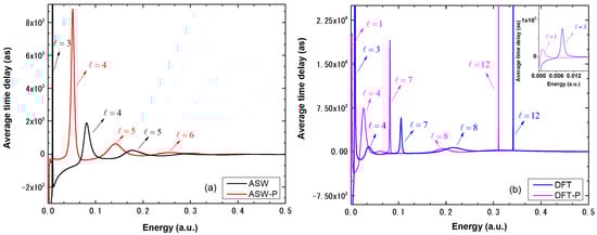 Average time delay of elastic scattering using model potentials (a) ASW (black) and ASW-P (red) (b) DFT (blue) and DFT-P (magenta). The average time delay behavior magnified in the low energy limit is shown in the inset for the DFT case. The resonant time delays are labeled with the corresponding partial wave’s angular momentum quantum number.
