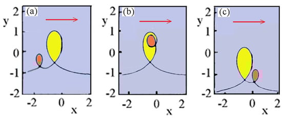 For a simple illustration of the multisoliton dynamics, we present the motion of 2D loop solitons of different radii r1 and r2, with the curvatures  and  []. The solution of the two loop solitons is obtained by the same Hirota transformation of the mKdV equation into bilinear form, as above, and the result is presented in Figure 6.