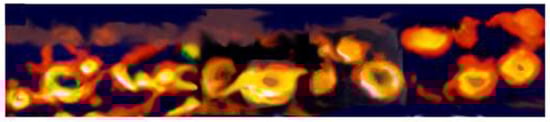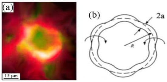 As shown in these laser experiments, even an isolated vortex ring can afford to accommodate a number of instability modes. Fukumoto made classification of the observed rings relies on the theories of parametric resonance and takes into account that long-wavelength oscillations on isolated vortex rings—in the laser experiment—are excited by the additional external straining field []. Namely, the multipulse LMI causes repetitive or time-periodic modulation of the multipolar strain field in the interaction space. “This modulation is different in different regions due to in-homogeneity in the distribution of local strain-field symmetry. As a consequence, various types of instability are created in different regions of the quasi-linear array of rings” [].