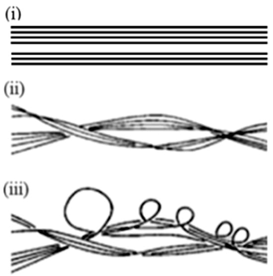 Multipulse laser–matter interactions with patterned target surfaces create a series of such loops—the loop-soliton chains on vortex filaments [,,], as well as supercomplex 3D networks []. The loop-soliton chain—such as the one generated on the Co-coated steel, may be compared with the chain of particles—a 1D periodic lattice (Figure 5).