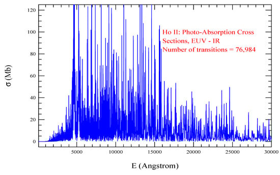 Figure 3 presents the photoabsorption spectrum of Ho II, which includes 76,984 transitions. However, very weak transitions lay outside the range of the plot. The figure shows the visible presence of lines from 4000 Å in UV to 18,000 Å in the IR region.