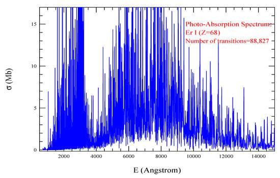 The spectrum of Er I presented in Figure 5 shows two broad features of strong lines, one in the UV region of 1000–3500 Å and the other in the O–IR region of wavelengths 4500–15,000 Å. The number of E1 transitions included in the spectrum is 88,827.