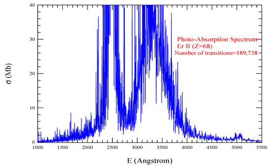 The spectrum of Er II presented in Figure 6 shows two broad features of strong lines, both in the UV region: one in the wavelength range of 2200–2700 Å and the other one in 2800–4000 Å. The number of E1 transitions included in the spectrum is 189,738.
