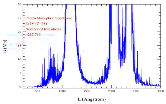 The spectrum of Er III presented in Figure 7 shows two broad features of strong lines, both in the EUV region: one in the wavelength range of 300–500 Å and the next one in 900–1700 Å. The number of E1 transitions included in the spectrum is 82,286.