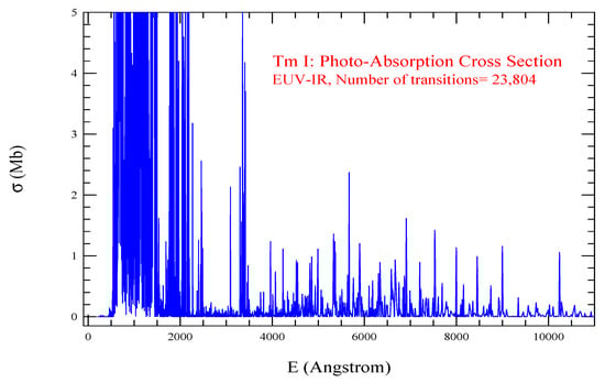 The photoabsorption spectrum of Tm V, presented in Figure 13, demonstrates the dominance of strong lines in the energy range of EUV to UV with a gap of about 700–1300 Å. It shows multiple broad structures from the EUV to the UV wavelength range, with the widest one being in the range of 1400–1900, Å with a dip at around 1650 Å. The number of transitions included is 259,539.
