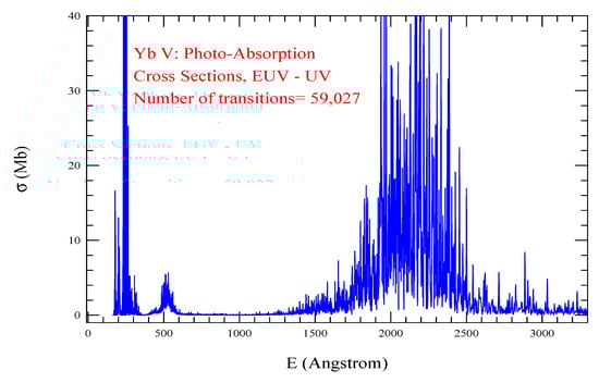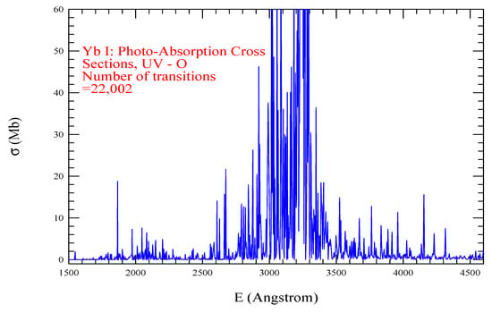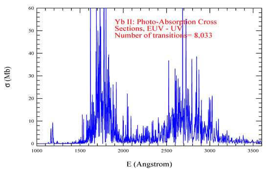 The photoabsorption cross-sections () of Yb II, presented in Figure 15, show dominating strong lines in the energy region of EUV–UV. The spectrum also shows two broad features, one in the wavelength range of 1500–2100 Å and another one at 2500–3100 Å. The number of transitions included is 8083.