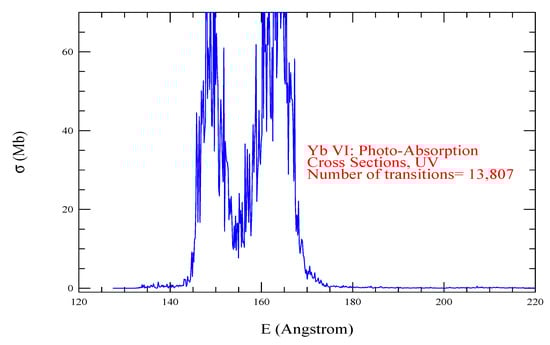 The photoabsorption cross-sections () of Yb IV, presented in Figure 17, have multiple broad features dominated by strong lines in the energy range of EUV–UV. The number of transitions included is 40,767.