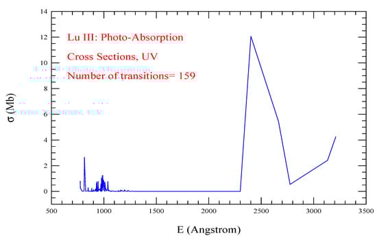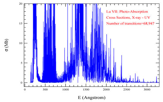 The photoabsorption spectrum () of Lu I, presented in Figure 20, shows prominent strong lines in the energy region of UV to IR. It has a few broader regions of strong photoabsorption lines in the energy regions of 1800 to 3000 Å, 3000–4000 Å, and 4300–4600 Å. The higher-energy region also demonstrates the presence of some strong lines. The number of transitions included is 3220.