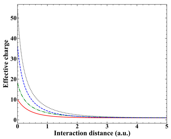 In Figure 2, we present the effective-charge profile of various targets as a function of the interaction distance with the active electron. The effective charge of all objects decays exponentially with increasing interaction distance. Moreover, the effective-charge values become almost equal for interaction distances larger than , and they approach to unity.