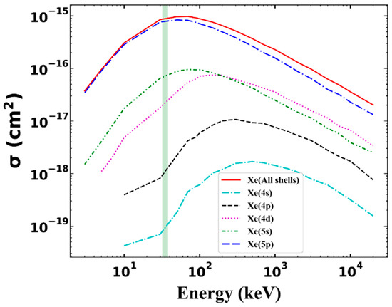 Figure 3 shows the TCS of the single-electron ionization from Xe by protons for various sub-shells. For impact energies below 50 keV, we clearly see that the contribution of the inner shells to the TCS is insignificant, with the ionization from the 5p shell approximately approaching the TCS. Beyond 50 keV, the contribution of inner shells to the TCS increases when increasing the impact energy. According to this result, we will include the contributions of the inner shells into the TCS cross sections. However, for the case of ionization differential cross section at impact energy of 35 keV, it is a good approximation to consider only the 5p shell, see green shaded area in Figure 3. From Figure 3, we can also see that the cross section maxima of inner shells shift to higher energies. Moreover, the TCS of the 5s shell surpasses the TCS of the 4d shell up to impact energies around 120 keV, but above this energy, the TCS of the 4d shell becomes larger.