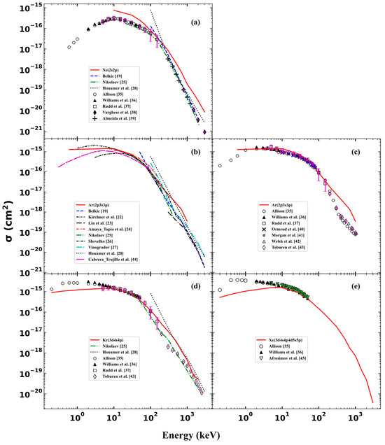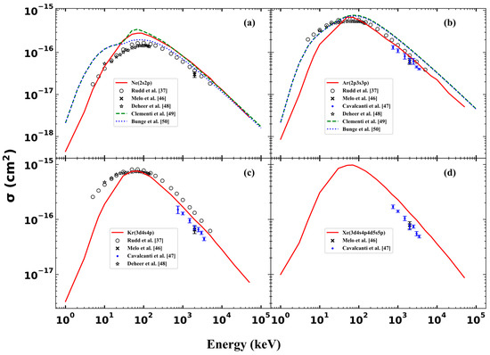 For a single ionization in the collision of a proton with Ne, Ar, and Kr, Rudd et al. [37] performed experiments in the impact-energy range between 5 and 5000 keV. Melo et al. [46] studied the ionization of Ne, Ar, Kr, and Xe at 2 MeV protons. Cavalcanti et al. [47] studied multiple ionization of Ar, Kr, and Xe in the energy between 0.75 and 3.50 MeV. De Heer et al. [48] presented an ionization cross section of proton collision with Ne, Ar, and Kr in the range 10–140 keV. The results by De Heer et al. [48] are in agreement with the results by Rudd et al. [37]. Regarding the theoretical data, Clementi et al. [49] and Bunge et al. [50] provided data for all sub-shells of and collisions. However, for and collisions, Clementi et al. [49], Bunge et al. [50] and others [51,52,53,54] provided ionization TCS for inner-shells only, namely, K and L shells. for collision, and K, L, and M shells for collision. We did not show these results in our present work due to their negligible contribution to the overall TCS, as discussed in Figure 3. Clementi et al. [49] and Bunge et al. [50] employed Roothaan–Hartree–Fock (RHF) method in their study.