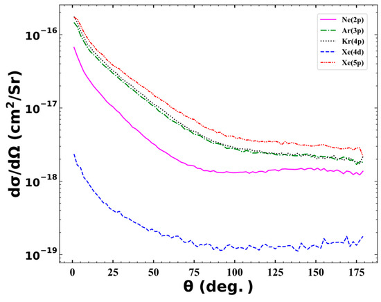 For electron energies ranging between 50 eV and 100 eV (see Figure 11c), the DDCS values are smaller compared to previous electron energy ranges. The DDCS curves of Kr(4p) and Xe(5p) are almost equal and decrease slowly until they reach the 90° scattering, then they show almost constant values. The DDCS values of Ar(3p) are nearly equal to the DDCS values of Kr(4p) and Xe(5p) in the forward scattering. However, the DDCS curve has a minimum at 90° scattering. The DDCS values increase in the backward scattering. The DDCS values of Ne(2p) are much smaller than those of Ar(3p), Kr(4p), and Xe(5p) in forward scattering. The DDCS curve of Ne(2p) shows a minimum around the 90° scattering similarly to the case of Ar(3p). Moreover, in the backward scattering, the DDCS values of Ne(2p) increase slowly, and they are almost equal to the DDCS values of Ar(3p).