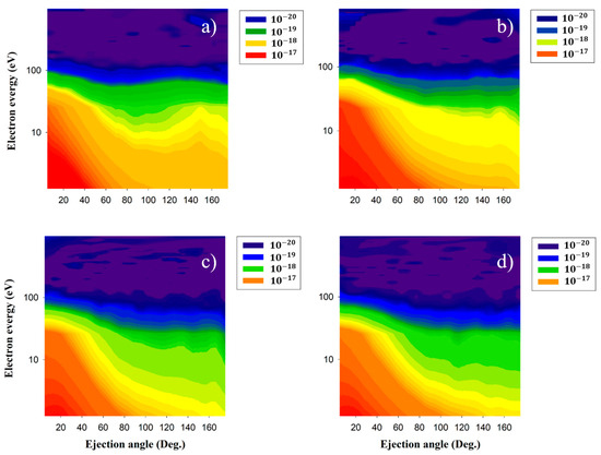 For electron energies ranging between 100 eV and 1000 eV (see Figure 11d), the DDCS values are very small compared to the lower-energy cases discussed earlier. Due to the low calculation statistic effected by a low number of ionized electrons, the DDCS curves for all targets are now tangled, especially for ejection angles larger than 120°, and they show very close values to one another. However, the DDCS values of Ne(2p) are the smallest by a narrow margin, while the DDCS values of Xe(5p) are the largest by a similarly small margin for ejection angles less than 120°.