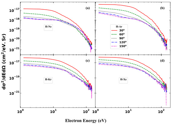 In backward scattering at ejection angles of 120° and 150° (see Figure 10d,e), the DDCSs exhibit the same behavior. The DDCS of Ne(2p) maintains a constant value for energy below around 20 eV. Furthermore, the DDCSs of Ne(2p) and Ar(3p) for energies below around 40 eV are lower than the DDCSs of Kr(4p) and Xe(5p). However, for energies between around 40 eV and 100 eV, the DDCSs of Ne(2p) and Ar(3p) are higher than those of Kr(4p) and Xe(5p).