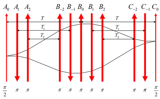 We next consider a PSI augmented with LMT. In Figure 1, we describe schematically the basic approach for LMT for a PSI [14,16,17,18]. Recalling briefly, the LMT scheme works as follows. The conventional sequence of three counter-propagating Raman pulses (denoted as , , and ) are augmented by additional counter-propagating pulses. For an LMT of order , the process requires the application of additional pulses. In Figure 1, we have illustrated the case for . In this case, the first additional pulse () propagates in an effective direction opposite to that of the initial pulse (). For the next pulse (), the effective direction is opposite to the previous pulse (). The effective directions of the rest of the additional pulses are also shown in Figure 1. It can also be seen that the pulse sequence is symmetric about pulse . The pulse sequence for an arbitrary order of LMT can be obtained by generalizing this pattern. As shown in Appendix A, the acceleration-induced phase shift of an atom interferometer with LMT can be expressed as and the rotation-induced phase shift as , where is the effective wavenumber of the counter-propagating Raman beams, whose absolute value is approximately ; is the linear acceleration; is the angular velocity; and is the displacement of the atoms from pulse to . The values of the time intervals and are defined in Figure 1.