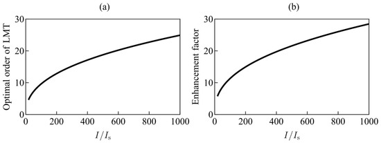 (a) Optimal order of LMT as a function the Raman beam intensity. For nth order of LMT, . For the Raman transition , . (b) LMT-induced sensitivity enhancement factor as a function of the light intensity.