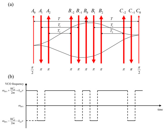 It should be noted that, for the modality described in Figure 5, no additional optical beams or hardware are needed for implementing the LMT process for any order. To see why, note that for the LMT protocol illustrated in Figure 7a, the effective propagation directions of the (counter-propagating) Raman beams need to be swapped for some pulses. As illustrated earlier in Figure 7b, there already exist two pairs of counter-propagating Raman beams in opposite effective directions. For concreteness, we assume that the two frequencies for the Raman excitation are generated with an electro-optical modulator (EOM) driven by a voltage-controlled oscillator (VCO). When the atoms move with an offset velocity parallel to the Raman beams, the resonant frequencies of these two pairs of Raman beams are different due to the Doppler shift. Therefore, by tuning the frequency of the VCO, it is possible to make the atoms experience Raman transitions due to only one of these counter-propagating Raman beams and not the other. Thus, the propagation directions of the Raman beams can be effectively swapped by simply tuning the frequency of the VCO. The timing of the VCO frequency necessary for the LMT protocol is illustrated in Figure 7b. The Raman pulses are typically on the order of a few microseconds, and the frequency jump shown in Figure 7b can be completed in 0.1 ms (corresponding to a modulation bandwidth of 100 kHz, which is commonly achievable). These time scales are much shorter than the interrogation time. Therefore, it is generally not difficult to fit in all the LMT pulses within the interrogation period.