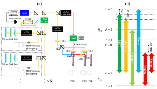 For concreteness, a possible implementation of a PSI-based IMU employing 87Rb is shown in Figure 8. Figure 8a shows the layout of the optical beams. Only one laser is needed in this implementation, assuming it has high enough output power. For example, a Toptica TAPro with an output of 4 W should work for such a design. The laser frequency is locked to the cross-over saturated absorption resonance occurring between the to transition and the to transition. Under this condition, the laser is 212 MHz red-detuned from the to transition [32]. The part of the laser output to be used for producing the MOT and molasses cooling is split into six separate beams (in Figure 8a, we have shown explicitly only one of these six beams). The beam for each MOT is sent through an upshifting AOM in the double-pass configuration, operating at a frequency of 100 MHz so that each MOT beam is detuned by 12 MHz below the to transition. The MOT beams turn into molasses beams when each of the AOMs is tuned to 60 MHz [10]. In this way, the detuning of the molasses beams is increased to 92 MHz and the intensity is also significantly reduced because the modulation frequency is far from the central frequency of the AOMs. The double-pass configuration ensures the stability of the alignment when the modulation frequency for the AOMs varies. Note that six different AOMs are needed in order to be able to generate the moving molasses for the launching process.