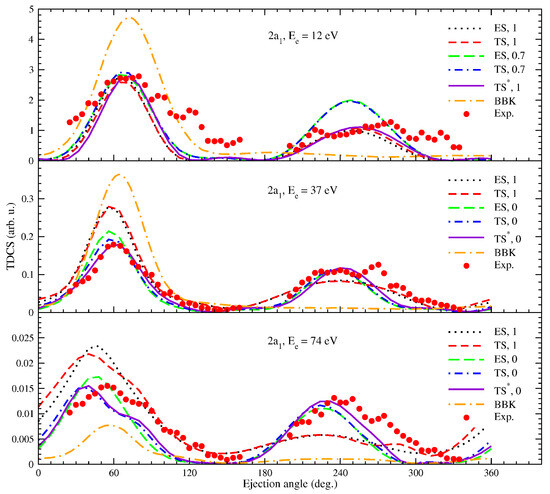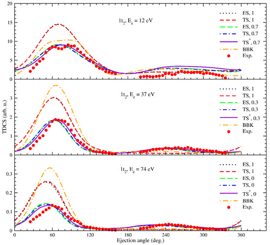 We employed the models presented above in Section 2.3 to calculate TDCSs for both projectile types. Across several studies, we analyzed molecular targets like H2 [13], N2 [14], H2O [15], [16,18], and [17,18]. TDCSs are an important part of the tool-set of theoretical and experimental studies. They give a complete description of the ionization process for a given orientation of the outgoing particles momenta and the electron energy. In Figure 3 and Figure 4, we show a few results from [16], where we investigated the ionization of methane impacted by electrons. TDCSs were determined for the and molecular orbitals, respectively. Here, the energy of the scattered particle is eV, while the scattering angle was set to −. We calculated the TDCS for , 37, and 74 eV and compared our results with the measurements of [27] and the BBK (Brauner, Briggs, and Klar) model from the same study. As mentioned above in Section 2.2, the appearance of the backward peak is the result of a strong electron–nucleus interaction. However, our averaging method leads to a much weaker interaction. To overcome this deficiency of the model, we calculated the cross section also for an enhanced nuclear potential by systematically decreasing the radius of the sphere during the averaging process. In the figure legend, we show beside the name of the model the fraction of the initial radius for a particular case. We note that the experimental TDCS [27] was normalized to the forward peak of the model. Overall, the model shows the best agreement with the experimental measurements. For the orbital in Figure 3, at the lowest ejected electron energy, this model provides the correct binary-to-recoil peak ratio for the original radius of the nuclear-charge sphere. At higher energies, all the nuclear charge need to be moved to the molecular center ( model) to obtain the best ratio, although at eV, the peaks are observed at smaller angles than the experimental ones. Since the energy of the ejected electron is larger in this case, the post-collision interaction may play a more prominent role, causing the observed shift. We note that the PCI is not included in our calculations at this point. The BBK model shows a better positioning of the binary peak in this case but entirely lacks the backward peak.