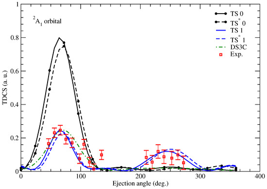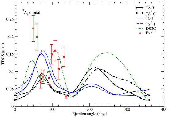 Since living tissues contain a large percentage of water, the ionization of this molecule is of great interest in radiology studies, for example. Below, we show a few results from [15] obtained for electron projectiles, since, in this case, experimental data were also available, unlike for positron projectiles. We calculated TDCSs employing the TS and models. The TDCSs were calculated for the , , , and molecular orbitals shown in Figure 5, Figure 6, Figure 7 and Figure 8. The obtained results were compared to the measured data of [28] and the TDCSs determined with the DS3C model (dynamic screening of the three two-body Coulomb interaction) [29]. We used a projectile with an impact energy of eV, where eV, except for the orbital, where eV. The projectile is observed at an angle of . It is worth mentioning that for water, we obtain a two-sphere structure as we rotate the molecule around the center of mass. The charge of the O nucleus is distributed on the smaller one, and the charge of the H nuclei are evenly distributed on the larger sphere.
