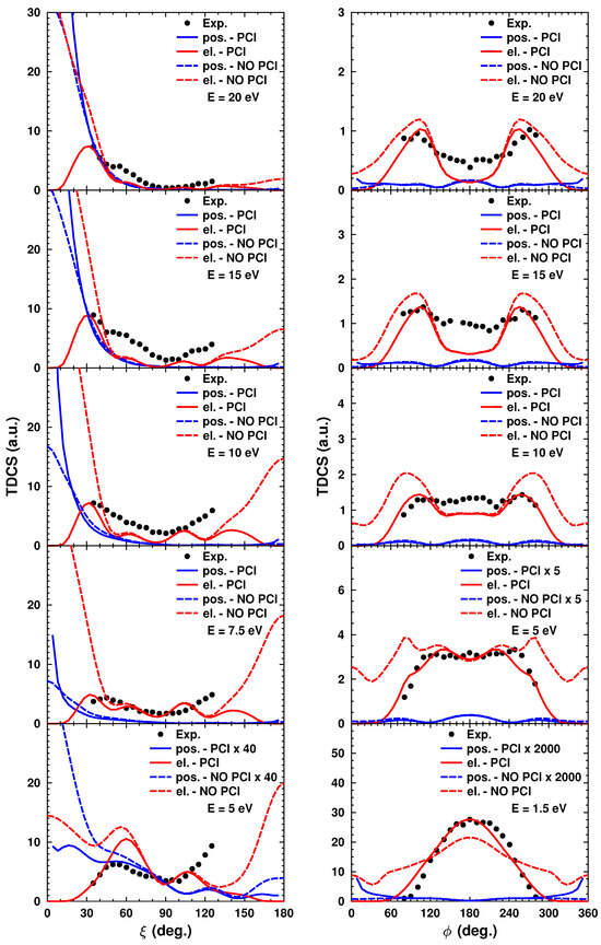 Finally, we show some of our results for the NH3 molecule from [17]. We calculated TDCSs for both projectile types and for several molecular orbitals. Here, we show a few results for the orbital. This study is somewhat different from the previous ones, since, here, we consider a coplanar geometry and a perpendicular geometry. In the latter case, the particles are ejected perpendicular to the incoming projectile’s direction. The scattered and the ejected particles emerge at the same angle (measured relative to the projectile trajectory) and with equal energy ( eV). We calculated the TDCSs using the model. At such a low and symmetric energy, it is very important to include the PCI. We included this interaction through the Coulomb distortion factor as detailed above in Section 2.3. Figure 9 shows the calculated cross sections with the PCI included and without this interaction. Our results for electron projectiles are evaluated against the measurements of [30]. In Figure 9, we plot the TDCSs calculated in the scattering and perpendicular planes (left and right columns, respectively). The results show that in both planes, the inclusion of the PCI is essential. Without the PCI, the agreement with the measured data is considerably poorer for electron projectiles. No experimental data were available for positron impact ionization. Figure 9 shows that in the scattering plane, for positron TDCSs, there is noticeable intensity only at very low ejection angles, with a narrowing intensity width for lower energies. In contrast, the forward peak of the electron TDCS migrates toward larger ejection angles as the energy is decreased. The somewhat opposite behavior for the two projectile types is related to the enhanced PCI at very low energies. In the first case, the positron drags the electron toward the incident direction. For an electron projectile, we have a strong repulsion with the ejected electron, which causes the increase in the ejection angle at very low energies. In the perpendicular plane, we observe that the calculated electron and experimental cross sections evolve from a two-peak structure to a single-peak structure with decreasing electron energies. This effect is also attributed to the post-collision interaction. The electrons at low energies emerge at a larger mutual angle due to the strong repulsion between them. Except for the lowest energy, the positron cross section shows a central peak, which may be attributed to an enhanced positron–nucleus interaction. The appearance of the central peak may be the consequence of a complex collision process. As the positron is scattered by the nuclei, it may knock out an electron, which may undergo a backscattering by the nuclear core. The lack of the central peak at the lowest energy may be related to the overwhelming dominance of the PCI.