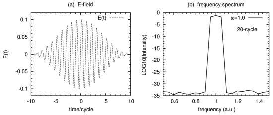 - Jiang, T.F.; Chu, S.I. High-order harmonic generation in atomic hydrogen at 248 nm: Dipole-moment versus acceleration spectrum. Phys. Rev. A 1992, 46, 7322–7324. [Google Scholar] [CrossRef] [PubMed]