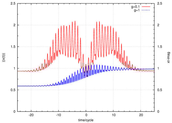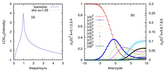 Table 2 shows the lowest six energy levels for several g-values, and Table 4 lists the dominant dipole moments for and . The energy levels are generally no longer equally spaced like the harmonic oscillator. The dominant transition moments are for the nearest and following near-neighbor states. Figure 6a depicts the harmonic generation spectrum for driven by the carrier frequency -cycle. The fundamental harmonic has a frequency around , where . The frequency is banded in for the second harmonic. The higher-order harmonics are negligibly small. Figure 6b shows the harmonic spectrum for the case driven by carrier frequency -cycle. Now that , the fundamental harmonic frequency is in and the second harmonic is in . The higher-order harmonics are negligible unless using a stronger electric field. We display the versus time in Figure 7. Similar to the previous Section 3.2, the is bounded and oscillating. Without the field, is a constant of time. Again, the ponderomotive energy [27,28] of an ionized electron inside the pulse in a driven atom plays no role here.