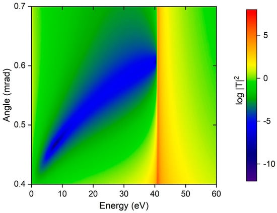 Following the calculation methodology described in previous sections and articles [19,20], we proceeded to evaluate the transition matrix element space for helium ionization in the gaseous state induced by proton impact at an intermediate energy of 75 keV. Given that quantum vortices, although potentially ubiquitous, are extremely difficult to detect, particularly in our case study involving a heavy projectile that extremely limits the angular range we focused, as a starting point, on identifying these critical points. This analysis was conducted under the constraint of a collinear geometry, meaning that the ejected electron’s and the proton’s outgoing angle are coincident. As a result of this approach, we obtained the FDCS plot in terms of the coincidence angle within a bounded range below 1 mrad and the electron’s outgoing energy, as shown in Figure 1.