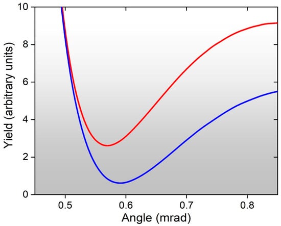As shown in Figure 3, the yield of the low energy section of the ECC cusp exhibits a notable decrease for angles that fall between the intermediate values corresponding to the vortex points. In our specific analysis with protons, we evaluated two different yield scenarios based on different energy ranges. The blue (lower) curve represents the yield for an energy range of 20 to 40.804 eV, which includes only the vortex point located near the ECC peak, situated at 0.604 mrad. On the other hand, the red (upper) curve shows the yield for a wider energy range, from 5 to 40.804 eV, which encompasses both vortex points located at 0.465 mrad and 0.604 mrad.