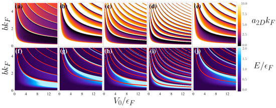 Upper panels: (a–e) correspond to s-wave scattering length in 2D for the model potentials in Equations (3)–(6). Bottom panels: (f–j) are for the bound-state energy Eb. The range and potential depth are scaled with respect to Fermi energy εF and the inverse of the Fermi wave vector kF. The red curves superimposed on the density color scheme of Eb correspond to the divergences of a2D.