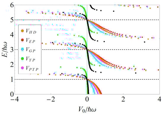 In Figure 2, we plot the first three energies in the center-of-mass frame of the energy spectrum as a function of the potential depth V0. Different colors identify the interaction potentials analyzed. For comparison purposes, we have included the contact potential labeled with black dots. Note that the energy shift in the case of the Gaussian potential has been previously studied in [44]. We have maintained the same value for the range to properly compare the results with the other potentials considered. Excluding the Yukawa potential for which the dimensionless range is set as β = 0.4, all of the other cases correspond to β = 0.1. Also, we must point out that although all of the curves in Figure 2 correspond to λ = 1, the same results are obtained for λ ≤ 1.